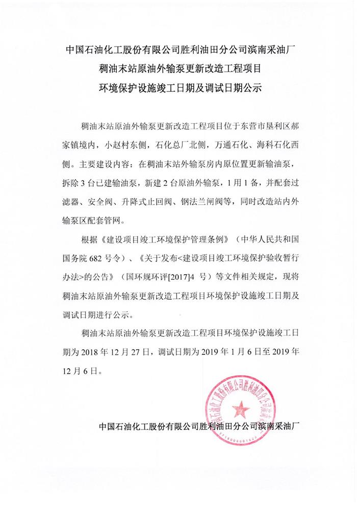 中國石油化工股份有限公司勝利油田分公司濱南采油廠稠油末站原油外輸泵更新改造工程項目環境保護設施竣工日期及調試日期公示