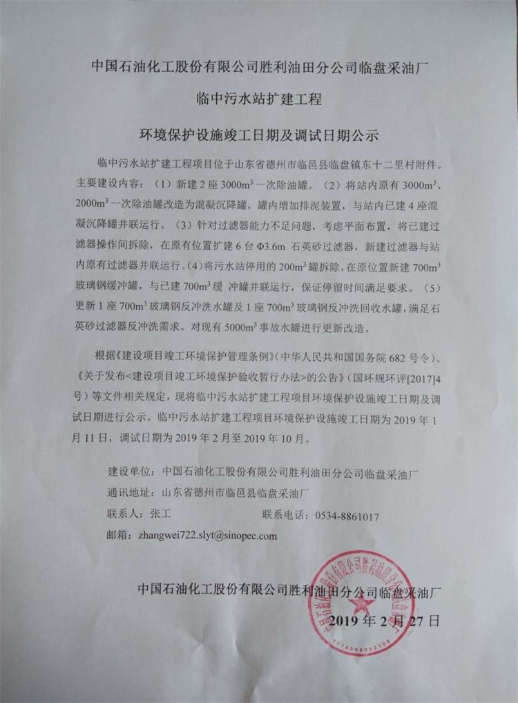 中國石油化工股份有限公司勝利油田分公司臨盤采油廠臨中污水站擴建工程環境保護設施竣工日期及調試日期公示